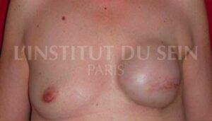 الثدي الأيسر صغير جدًا والطية تحت الثدييّة مرتفعة جدًا.
