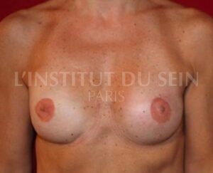 يمكن رؤية بدلة الثدي الأيسر في منطقة خط العنق وتبدو الهالة اليمنى متّجهةً إلى الأسفل قليلاً.