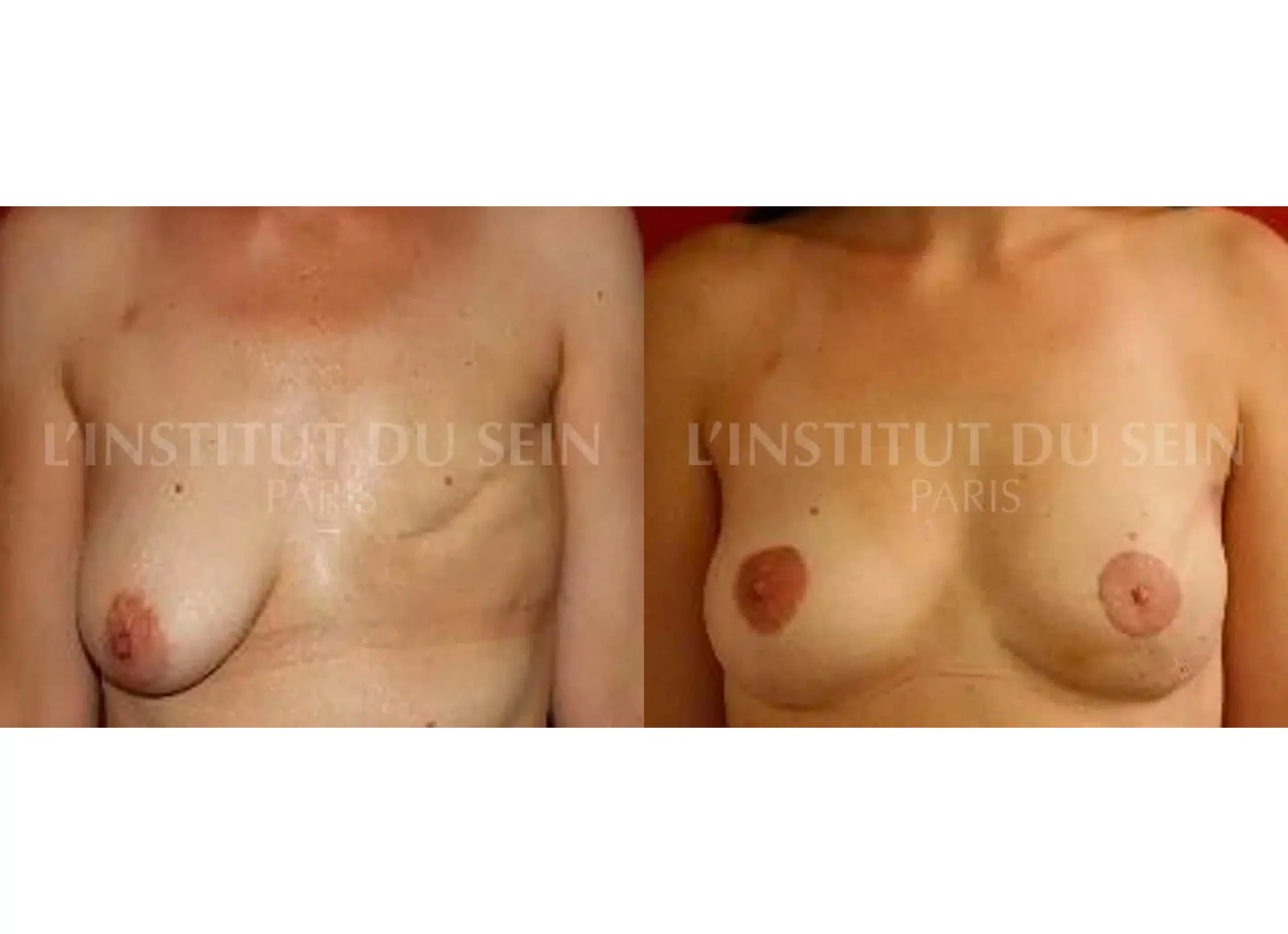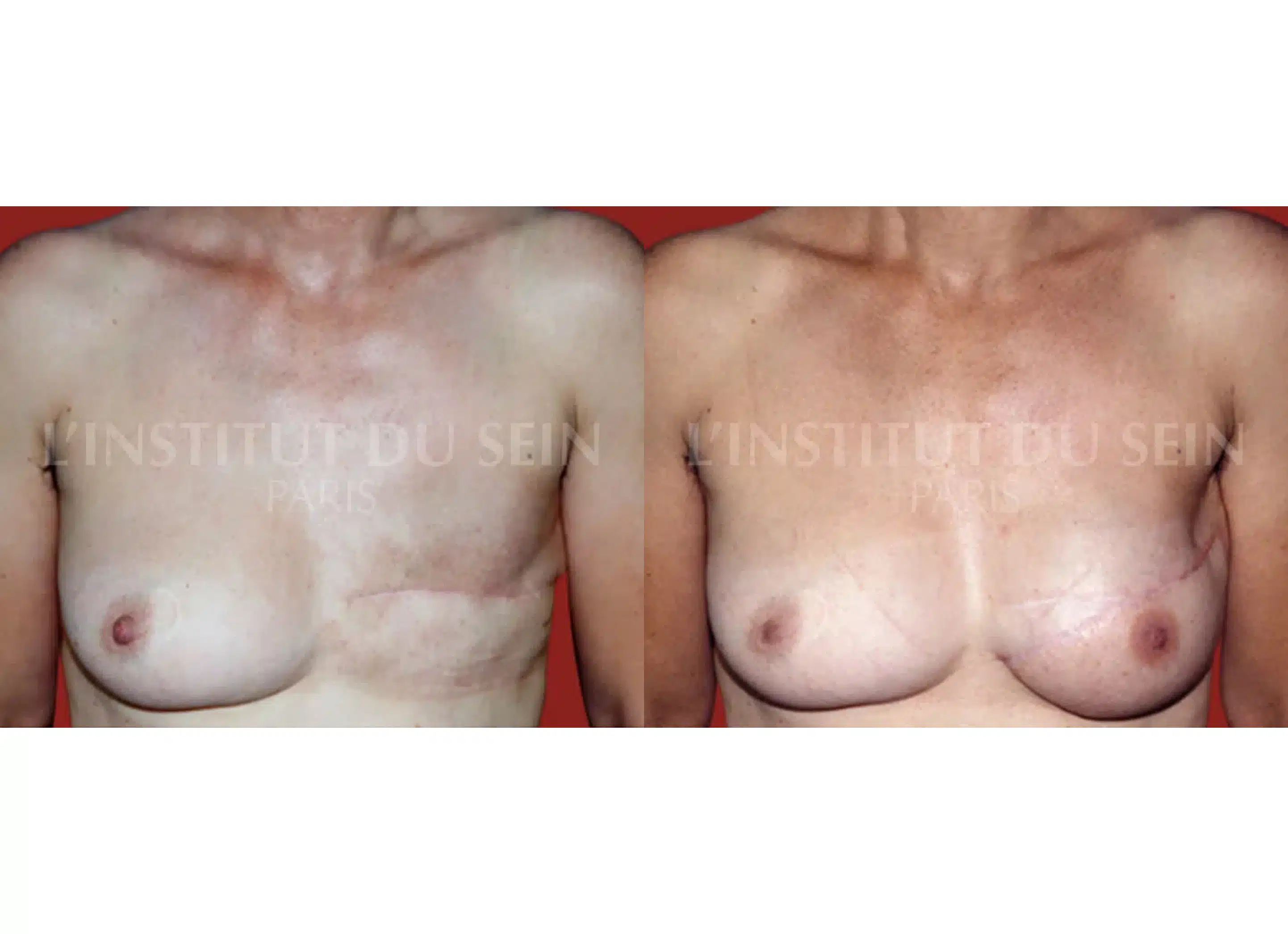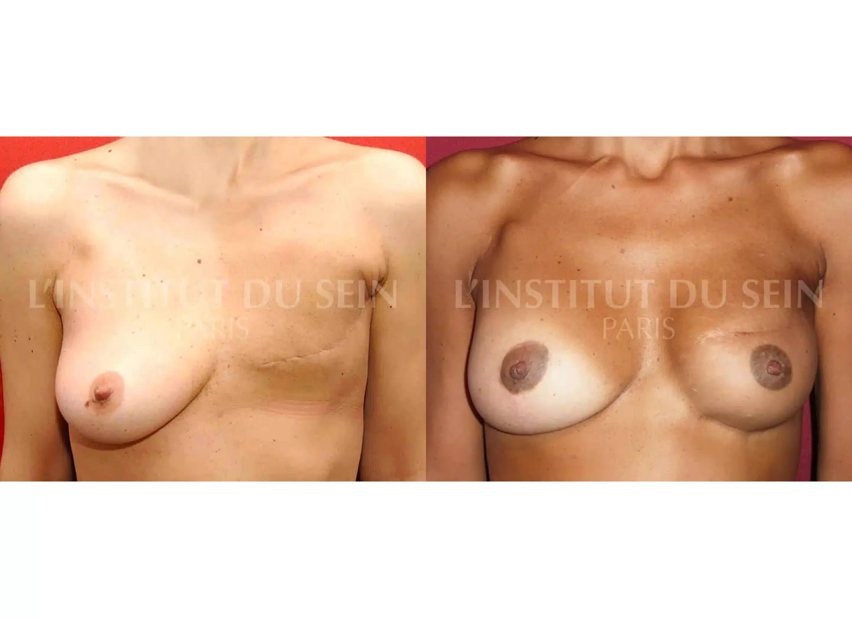 1.Mastectomie droite et radiothérapie. Reconstruction par prothèse et lipofilling. Augmentation du sein gauche par prothèse.
