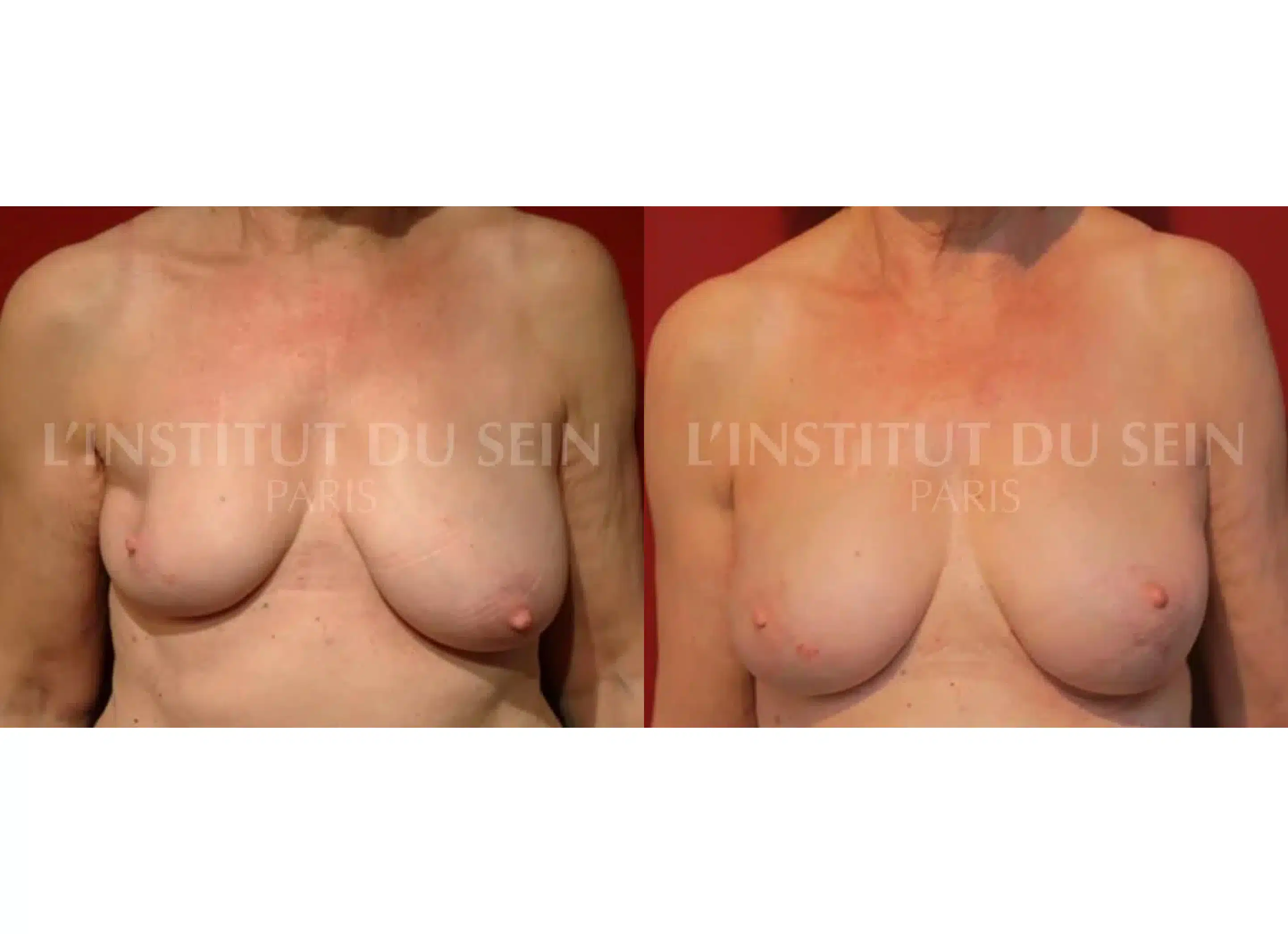 3. Tumorectomie sein droit et radiothérapie sur prothèses préexistantes. Retrait des prothèses, lipofilling droit et redrapage sein gauche.