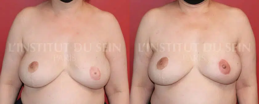 reconstruction de l’aréole droite par tatouage 3D (volume mamelon + tatouage) et tatouage de l’aréole gauche